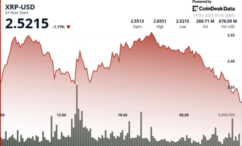 - XRP traded a $0.11 band (4 %) from $2.54 to $2.66 between Oct 13 05:00 and Oct 14 04:00.