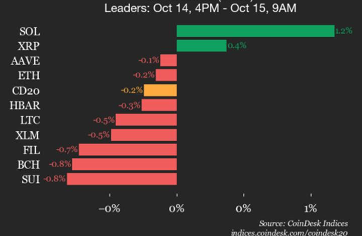 Leaders: SOL (+1.2%) and XRP (+0.4%).