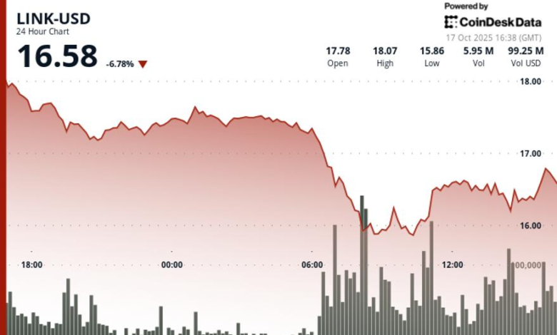 The native token of oracle network Chainlink fell sharply on Friday, dropping nearly 9% to $16.46, its weakest price since last Friday’s crypto crash.