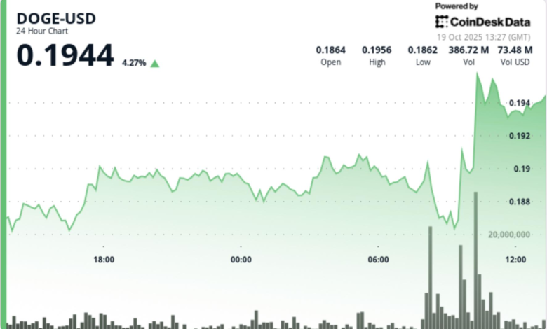 - DOGE’s rebound comes as broader risk assets stabilize following heavy midweek liquidations. The meme token added roughly 3% in the 24 hours to October 19 08:00, trading from $0.186 lows to a $0.191 peak.