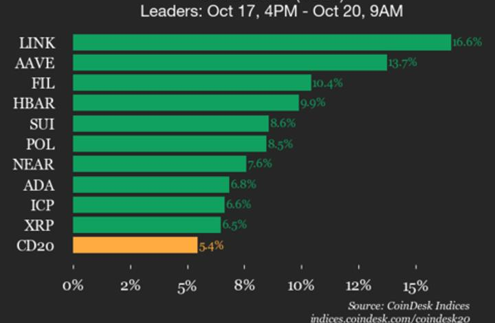 Leaders: LINK (+16.6%) and AAVE (+13.7%).