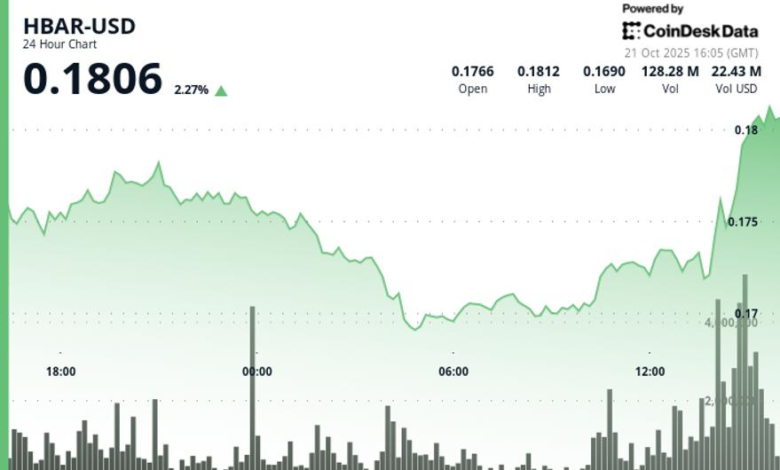 Trading volume spiked 71% above its daily average, with 67.16 million tokens exchanged at 04:00 GMT as HBAR broke below the $0.1720 support zone. The high-volume move suggested institutional participation in the selloff, which briefly pushed prices as low as $0.1688 before momentum eased.