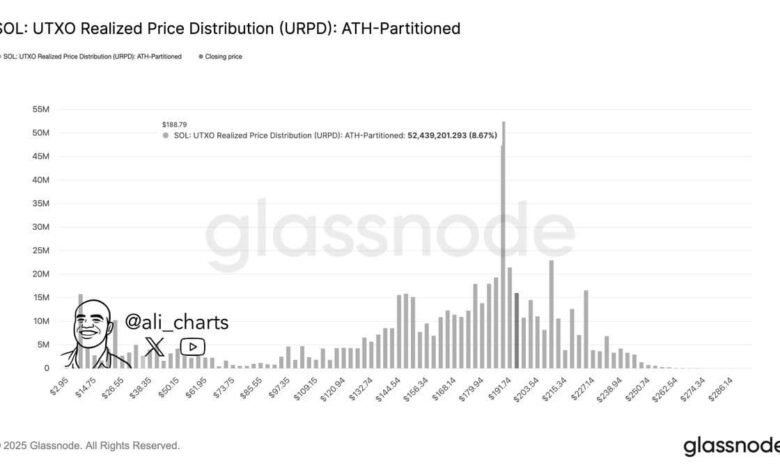 Earlier today, crypto nalyst Ali Martinez called $188 Solana’s most critical support and shared a Glassnode “realized price distribution” chart — a histogram of where large amounts of SOL last changed hands.