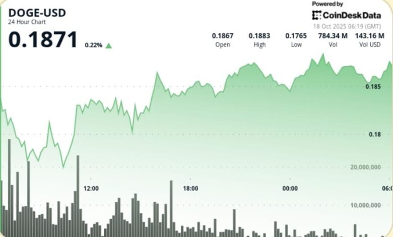 • DOGE traded between $0.176 and $0.189 through Oct 17, 06:00 – Oct 18, 05:00, a 6.7% range.