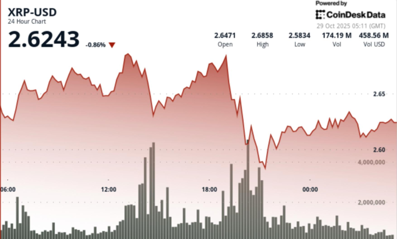 - XRP climbed 0.60% to $2.623 while trading volume surged about 47% above its seven-day average, indicating increased institutional interest amid a lack of strong breakout catalysts.