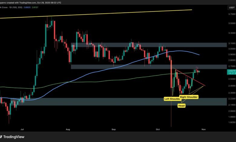 However, the market now faces a major resistance confluence around $2.7, aligning with the neckline structure and the upper boundary of the recent supply zone. This region represents the first decisive test for bulls. A clean close above $2.7 would confirm a structural trend reversal, opening the path toward the $2.9–$3.1 resistance cluster.